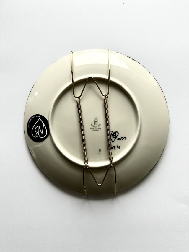 Add a touch of elegance to your home decor with this hand-painted one-off reclaimed vintage plate featuring a pretty gold rim. Perfect for lovers or anyone who appreciates unique, decorative pieces, this plate is designed primarily for display purposes. Complete with a golden plate hanger for easy wall hanging, this exquisite plate is sure to captivate and charm. Embrace romance and passion with a design that showcases a loving kiss, making it an ideal gift for someone special. Elevate your space with this beautiful and exclusive plate that exudes sophistication and style.